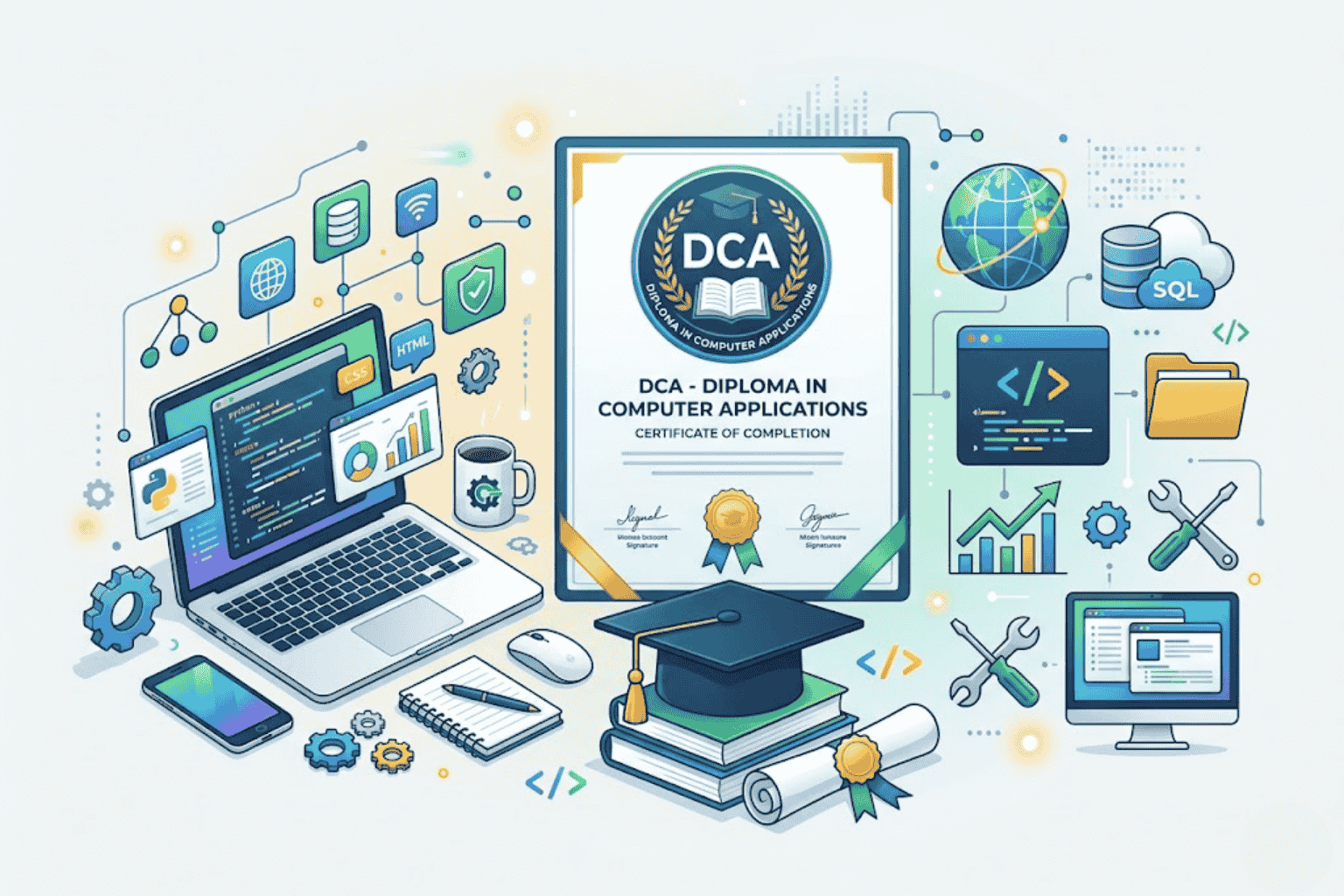 DCA (Diploma in Computer Applications) is a comprehensive program designed to build strong computer knowledge and practical skills.
